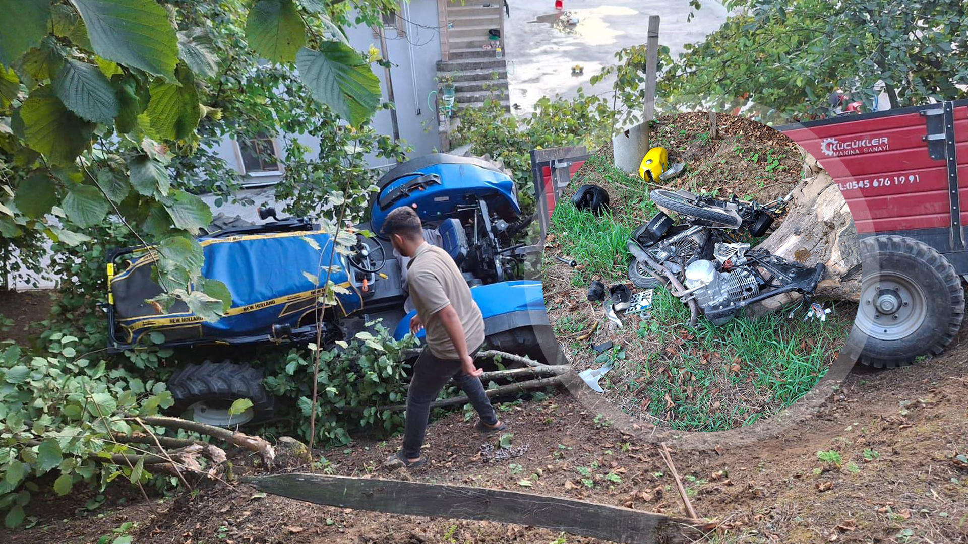 Kaza mahalle yakınlarında meydana geldi. Edinilen bilgilere göre motosiklet ile traktör çarpışırken, traktör sürücüsü bir süre sonra direksiyon hakimiyetini kaybetti. Fındık dallarını yerinden sökerek durabilen traktör yan yattı.